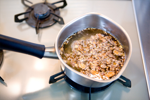 漢方薬一袋の中身の薬草をを鍋に入れます。