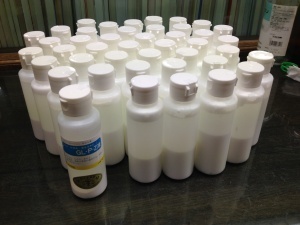 昔は大きなフラスコに入れていて、お客さんの注文がはいると、大きなスポイトで容器に入れて量り売りしていました。