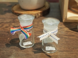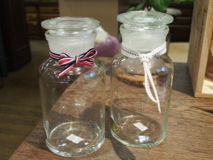 なんといっても可愛いし、実験用よりもずいぶんリーズナブルです。広口の薬品瓶にネクタイをつけてみました。