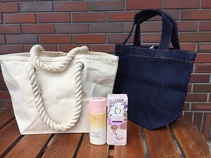 ただいま以下のお品物をお一つお買い上げの方に、限定の「厚生地ロープハンドルランチトート」「デニムランチトート」(1枚目の写真)のどちらかをプレゼントいたします。数に限りがございますので、お早めにお越しください。