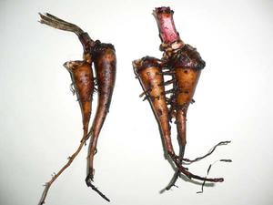 下の写真の茎がのびている右側の根が親根で「烏頭」、左にくっついている子根が「附子」の原料になります。写真ですとわかりにくいかもしれませんが、芽が出てきています。
